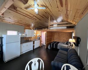 Each Camping Cabin offers one Queen Bed, 2 Queen Mattresses in the lofts, a pullout couch, a Dining Room Table and Chairs. It also features a Microwave, Refrigerator, Air Conditioner, Electric Fireplace, Utility Shelf, and a picnic table and charcoal grill.